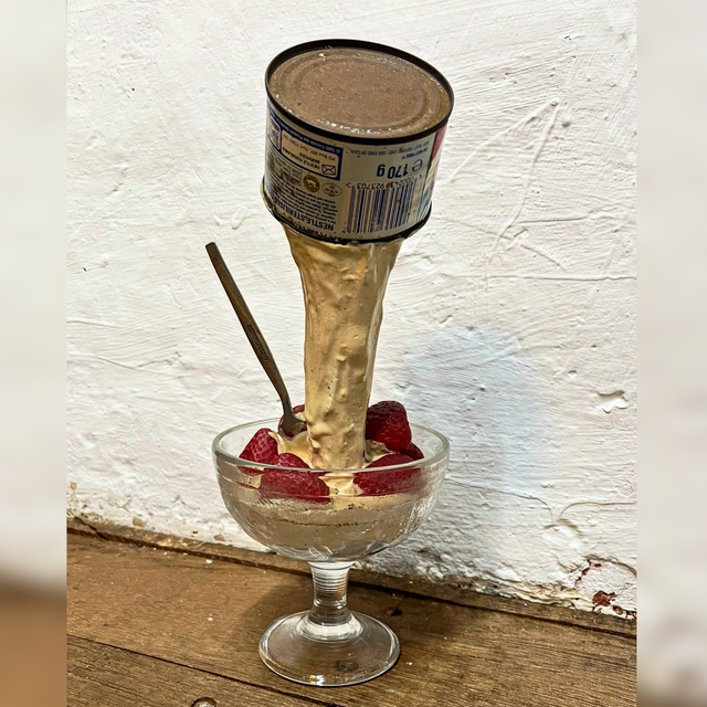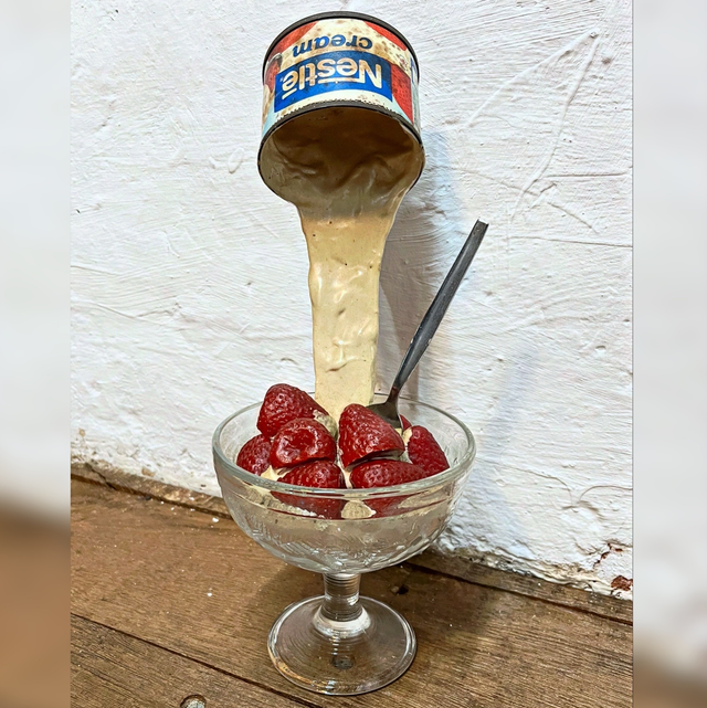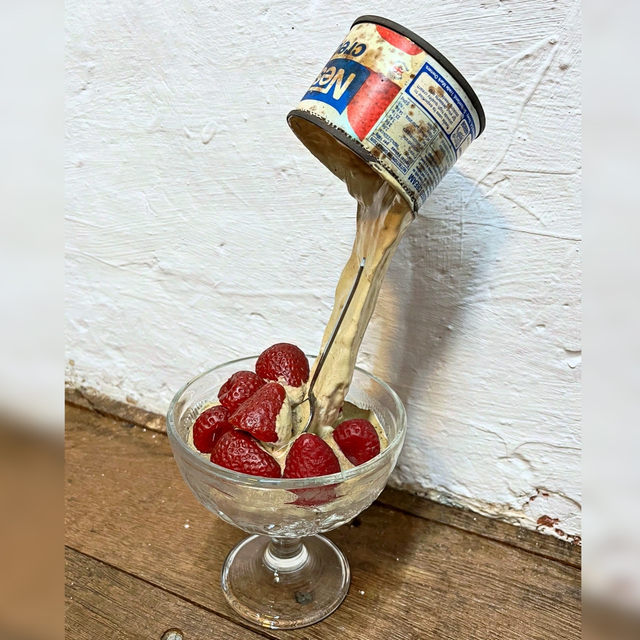 A quirky and unique piece of shop advertising for Nestle Cream. A glass fruit serving bowl, adorned with faux strawberries, with faux Nestle Cream being poured over them from above, complete with tin & spoon.