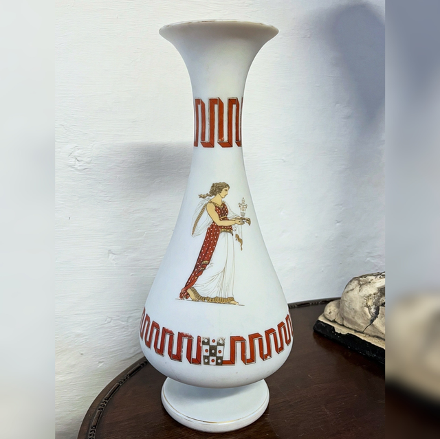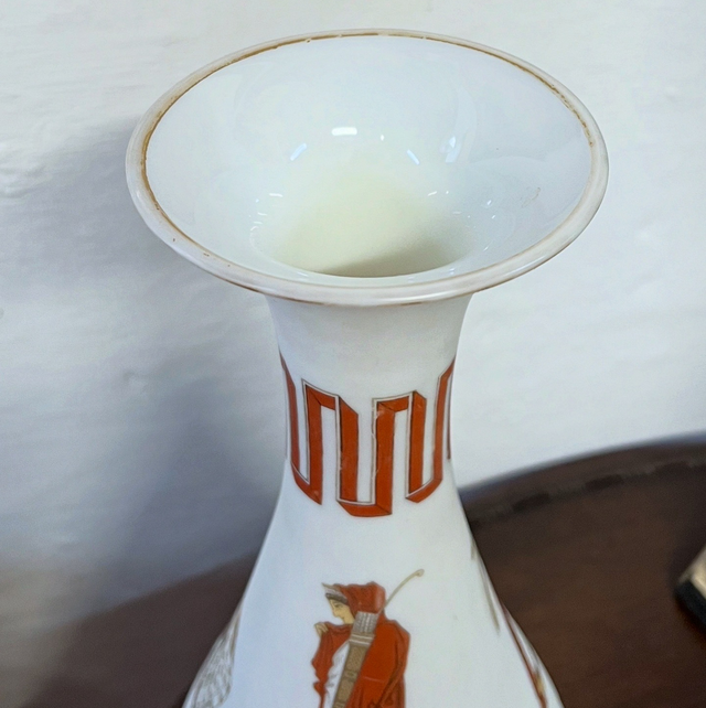 The vase is made of white opaline glass with neoclassical figures and orange geometric