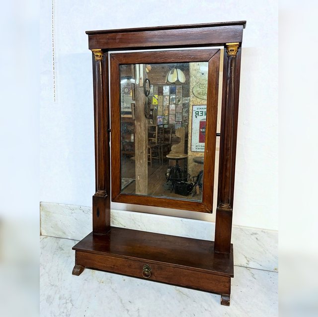 A nice example of a 19th century empire-style psyche/ toilet mirror, with gold gilded ornamentation. The mirror is made of mahogany and features a pivoting rectangular mirror plate supported by columns. The base includes a drawer for storage.
