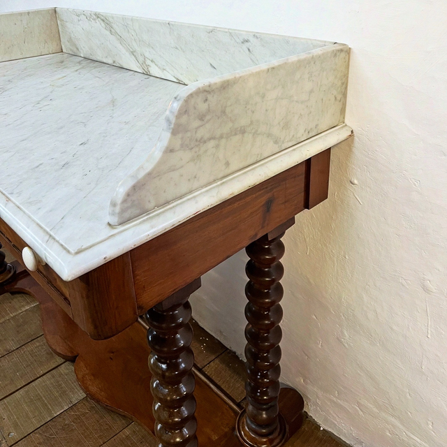 A fine quality 19th century Victorian two draw washstand. Made from mahogany, featuring barely twist legs with stretcher supports. Topped with carrara marble including backsplash.