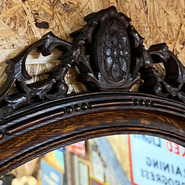 An impressive wall hanging, triple overmantle mirror. Dating to the 1930’s and made from oak, the frame features intricate carvings and a decorative crest at the top.