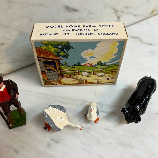 A superb New/ Old stock example of a complete boxed set of Britans Farm Toys. Made of lead the set of figures includes a farmer, a woman, two geese, and a pig.