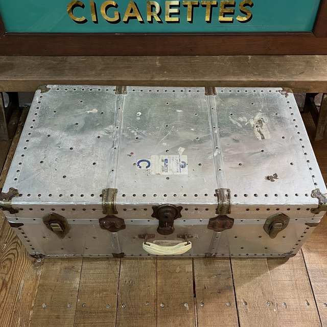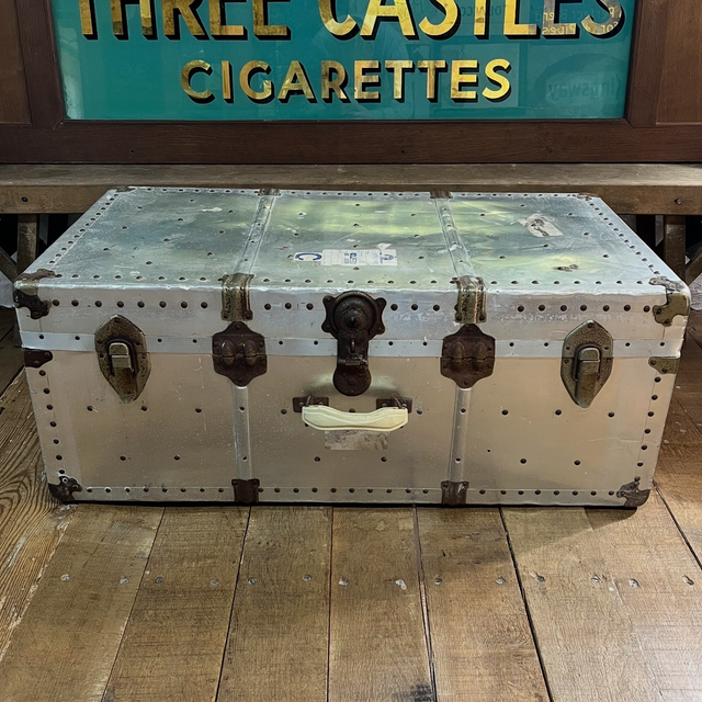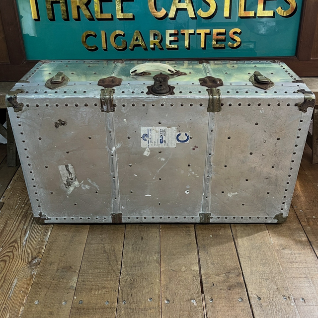 A fabulous antique aluminium/metal flight/steamer travel trunk. Iconic 1940’s design, this trunk is complete with leather side carry handles and with intact upper shelf. Riveted construction with corner guards.