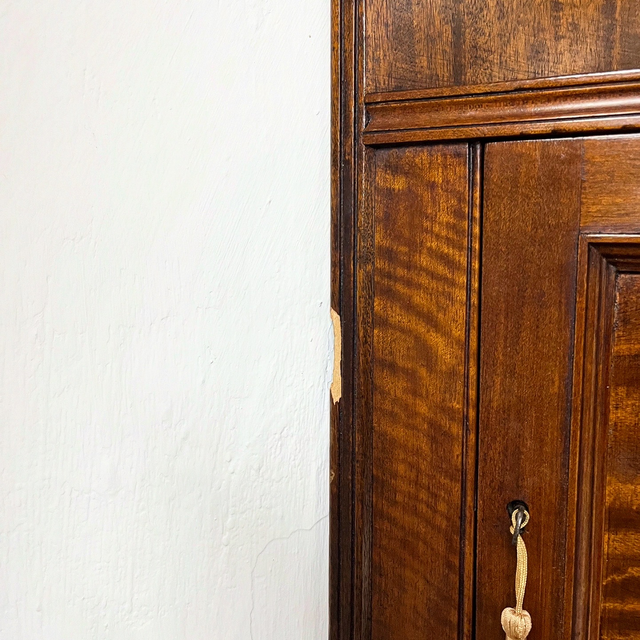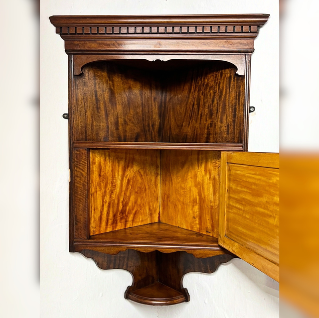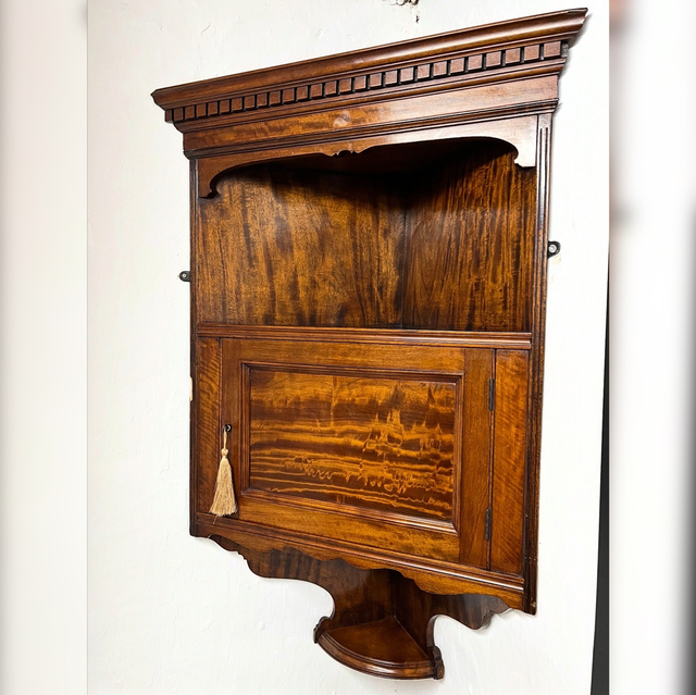 An Edwardian mahogany wall hanging corner cabinet, with dentil cornice over an open shelf and single door cupboard with key over lower shelf. In the manner of James Shoolbred.