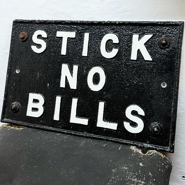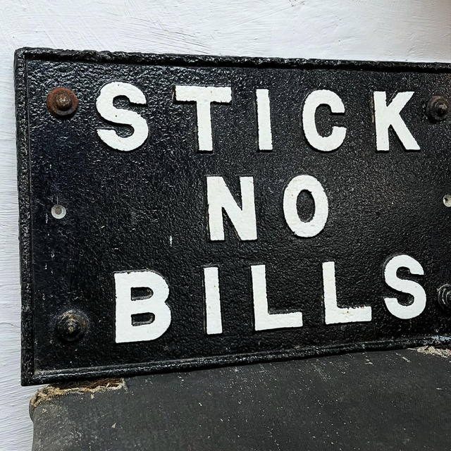 A superb and authentic original cast iron railway sign, boldly cast with the instruction “STICK NO BILLS”, once used to deter the posting of notices and handbills on railway property.