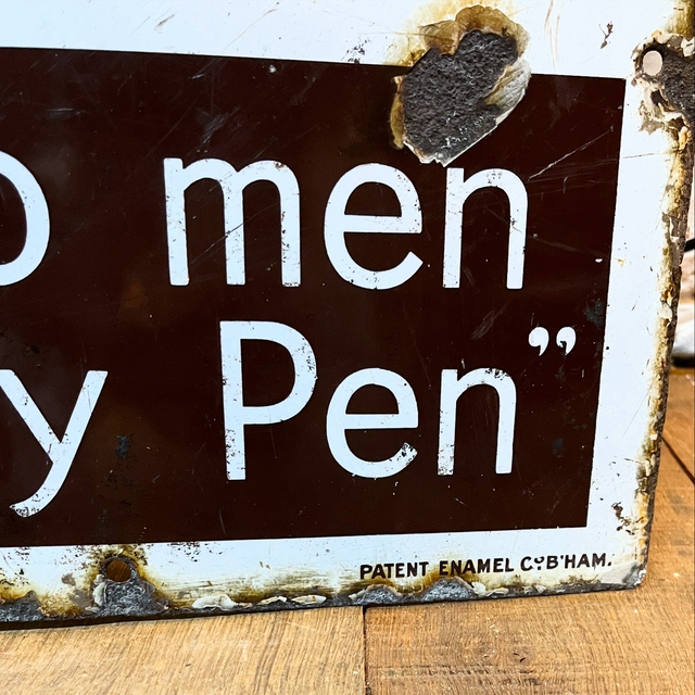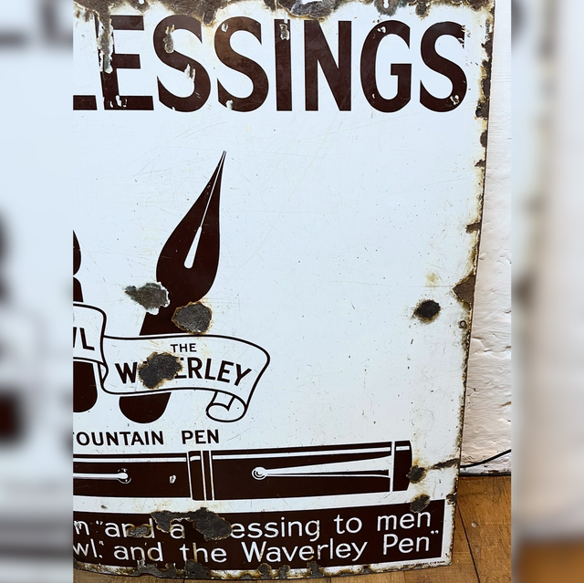 A single sided pictorial enamel advertising sign for Booms & Blessings, Waverley Fountain Pens. Circa 1910, this sign is of very large proportions and in good shape for the age, retaining a strong gloss and vibrant colour.