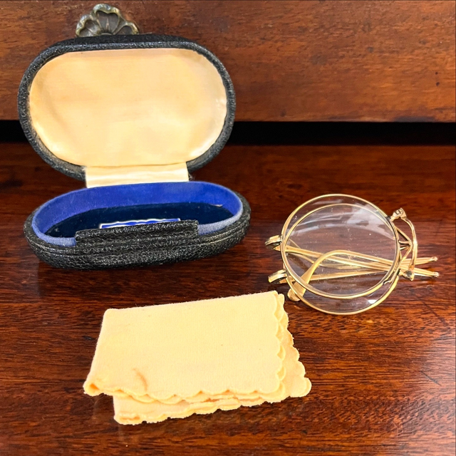 Condition; Very good antique condition. Light surface wear to the frames and case consistent with age. Hinges fold smoothly; lenses clear with only minor, age-expected marks. Case interior clean and intact.