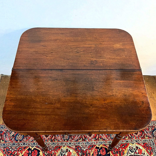 A beautifully refined George III mahogany fold-top tea table, showcasing the elegance, craftsmanship and poise characteristic of late 18th to early 19th century English furniture. Constructed in quality solid mahogany, the table features a finely shaped top with a moulded edge and a folding surface designed to double in size when opened, originally used for taking tea, cards or intimate social gatherings.