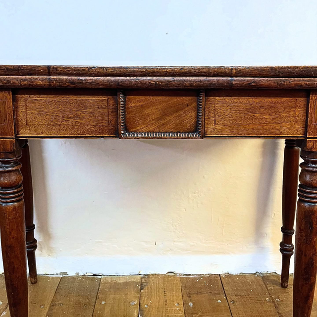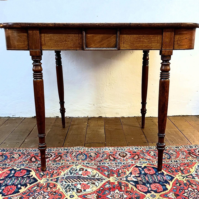 The frieze displays delicate crossbanding and inlaid detail, adding a sophisticated decorative flourish without compromising the restrained Georgian aesthetic. Beneath, the table stands on four ring-turned legs, tapering gracefully down to traditional peg feet, a classic hallmark of the period.