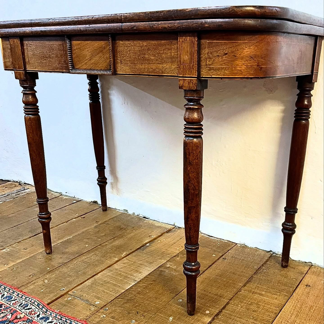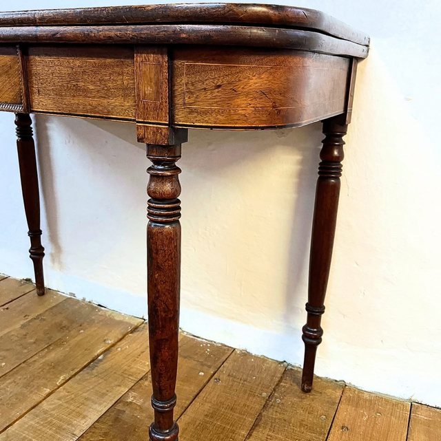 George III Mahogany Fold-Top Tea Table — Detailed Inlay, Ring-Turned Legs & Peg Feet. C. Late 18th to Early 19th Century