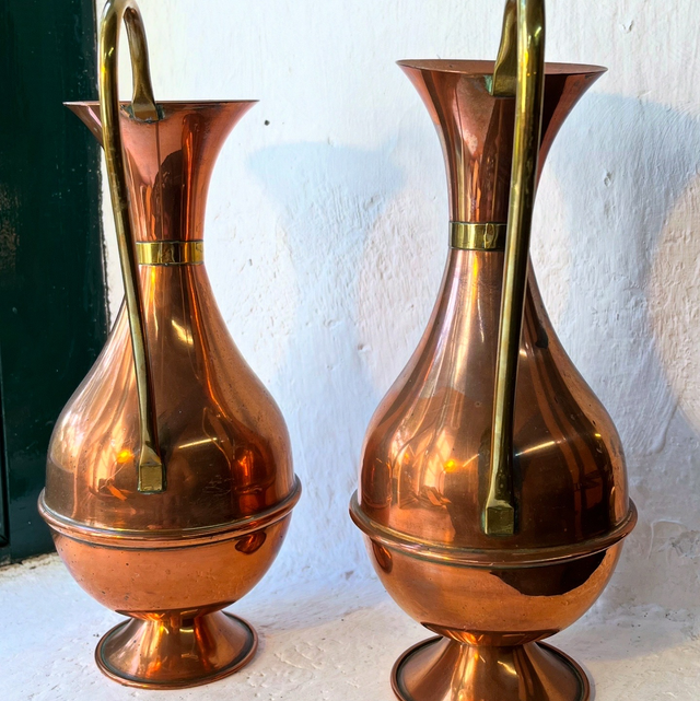 A pair of graduated brass and copper decorative jugs. Mid century and British made.