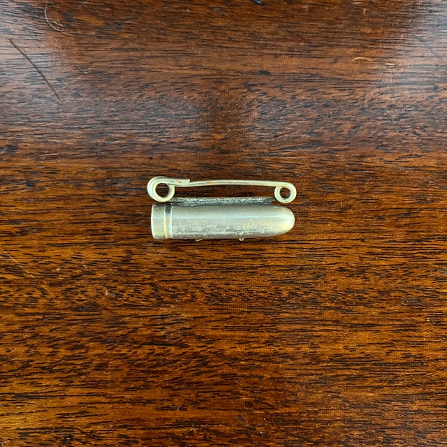 Condition; Good authentic condition for age. Enamel remains vibrant with only light age-related wear; brass bullet head shows expected patination. Coiled spring pin remains present and functional. A genuine and well-preserved example.