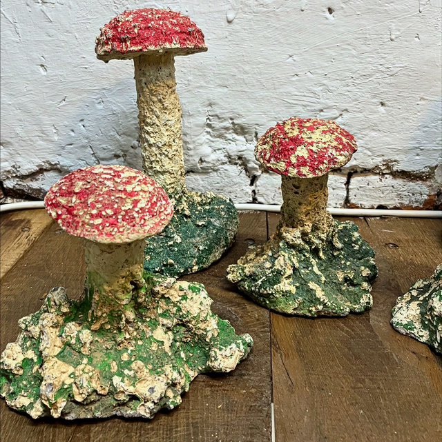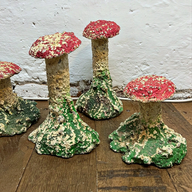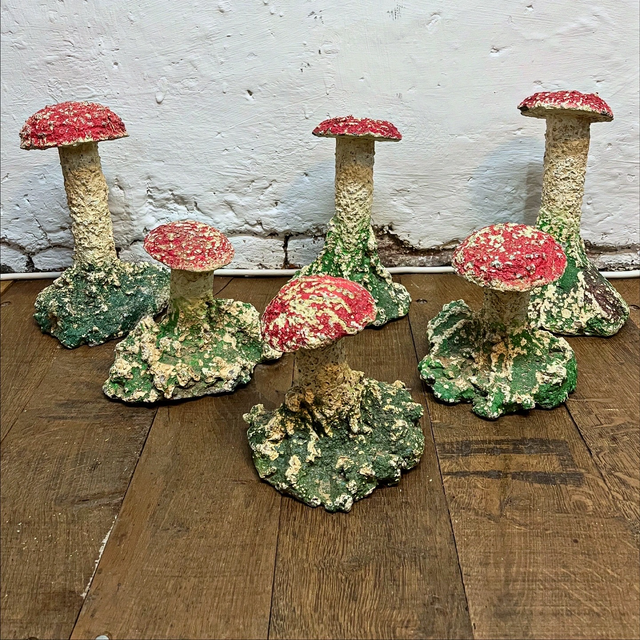 A wonderfully characterful set of six 1950s French composite stone toadstools, each one beautifully individual and full of rustic charm. Handcrafted and hand painted in vivid tones of red, cream, and moss green, these sculptural pieces capture the whimsical spirit of mid-century French garden décor.