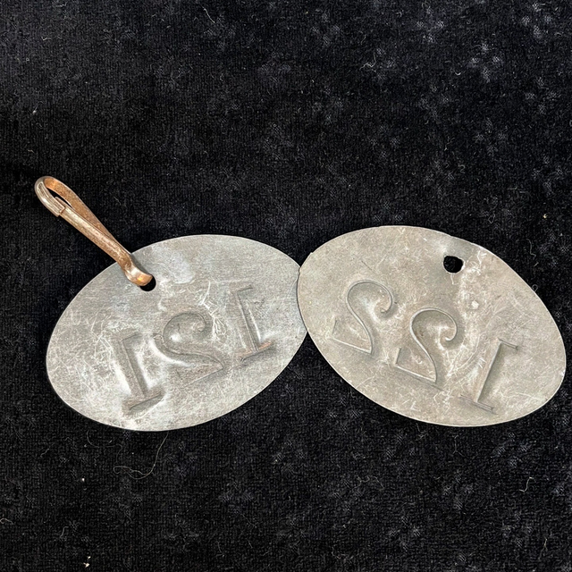 Two Vintage miners tally/ checks. In good condition and of large proportions, measuring 3” by 2” approximately.