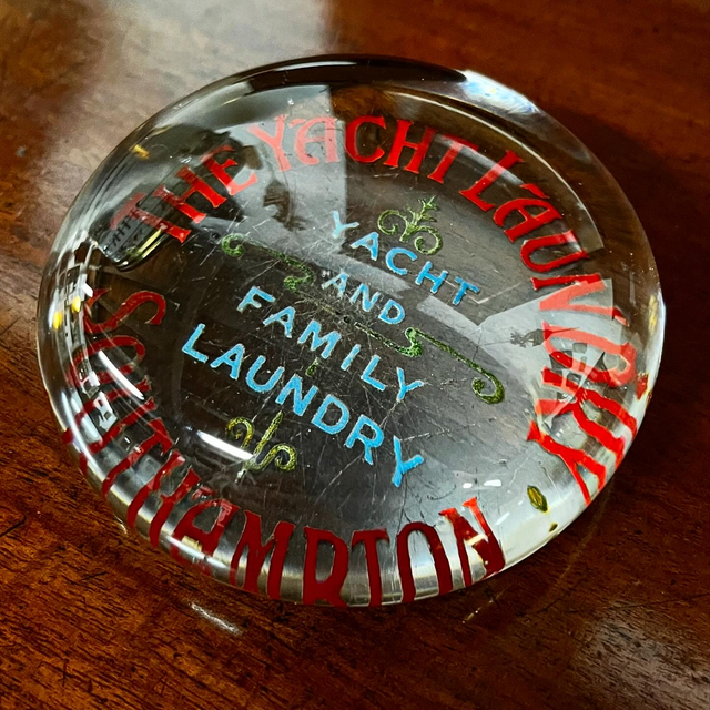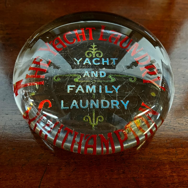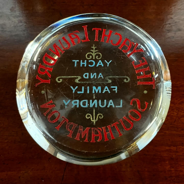 A fine Victorian reverse-painted glass advertising paperweight, dating from the late 19th century and promoting “The Yacht Laundry – Yacht and Family Laundry, Southampton.”