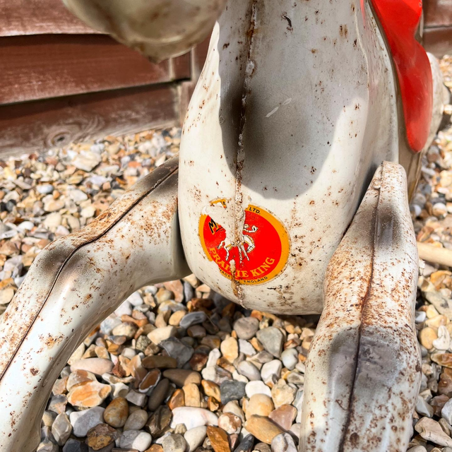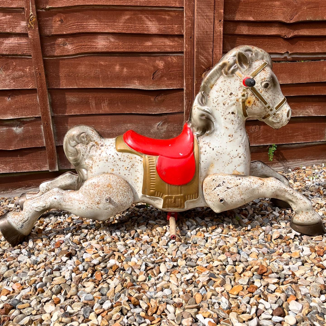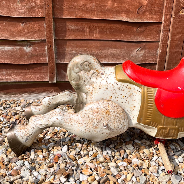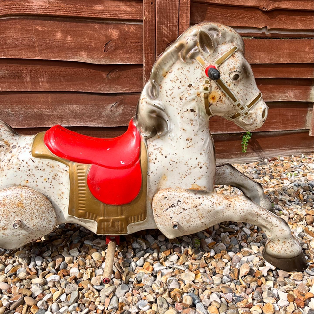 A staple of childhood nostalgia for many, a vintage Mobo “Prairie King” pressed-steel horse, made in England by D. Sebel & Co. Ltd.