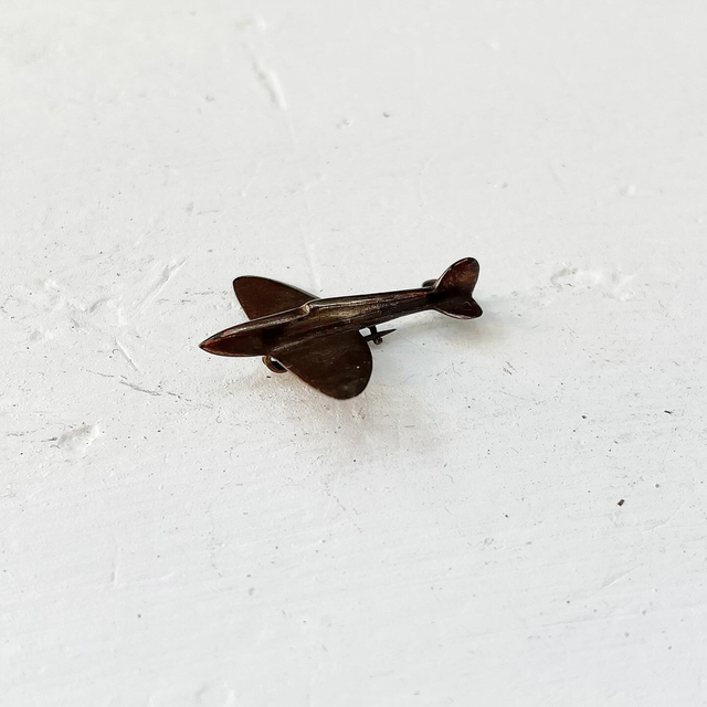 A charming and highly evocative original Second World War fundraising badge, expertly crafted from a genuine copper penny and formed into the unmistakable silhouette of a British fighter aircraft in flight.